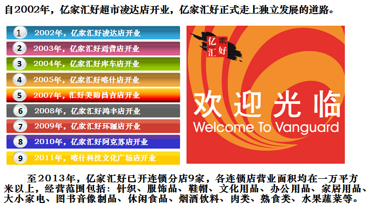 億家匯好商貿(mào)有限責(zé)任公司于2002年成立,并從臺灣引進(jìn)連鎖經(jīng)營職業(yè)管理團(tuán)隊,統(tǒng)一管理旗下各地的連鎖超市。公司通過多年的穩(wěn)健發(fā)展,至2013年底,億家匯好商貿(mào)有限責(zé)任公司已成為擁有員工近3000多人,下轄一個配送中心和9家連鎖超市的大型綜合性零售企業(yè)。總經(jīng)營面積11萬多平方米,配送中心輻射公司所有超市,年配送額可達(dá)2億元。公司大量吸納下崗職工,經(jīng)過崗前培訓(xùn),提高勞動技能,實現(xiàn)了他們的再就業(yè),為維護(hù)社會和諧穩(wěn)定做出了貢獻(xiàn)。2013年,巴州億家匯好商貿(mào)有限責(zé)任公司在自治區(qū)零售業(yè)中穩(wěn)踞前三位,是自治區(qū)重要的流通龍頭企業(yè),2013年年銷售收入達(dá)10億人民幣。多年來,公司一直重管理、抓實效、運(yùn)用先進(jìn)的管理手段和營銷理念,秉承億家匯好人 時時尋求效率創(chuàng)新,事事講究專業(yè)技術(shù)的文化精髓,創(chuàng)造了良好的經(jīng)濟(jì)效益和社會效益。公司先后多次被消費(fèi)者協(xié)會評為誠信單位,并多年被評為重合同,守信用單位。